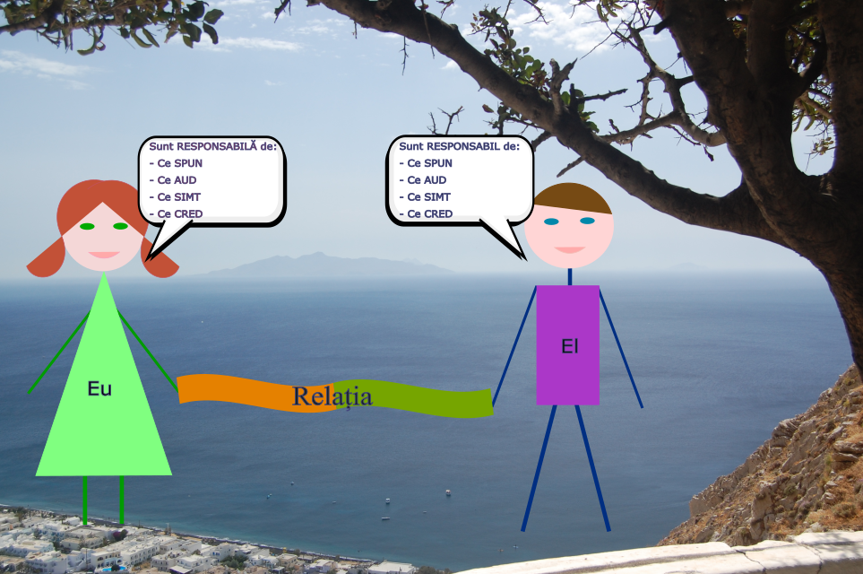 Ce înseamnă această responsabilitate? Înseamnă să fiu conștient de ceea ce spun în relație și de modul în care spun. Eu sunt responsabilă pentru mesajul care pleacă de la mine, dar felul în care îl aude, respectiv semnificația pe care i-o dă celălalt este responsabilitatea lui. În mod similar, eu sunt responsabilă pentru sensul pe care îl dau mesajului primit de la celălalt. Cât de des vi se întâmplă ca ceea ce transmiteți să fie înțeles diferit de celălalt?