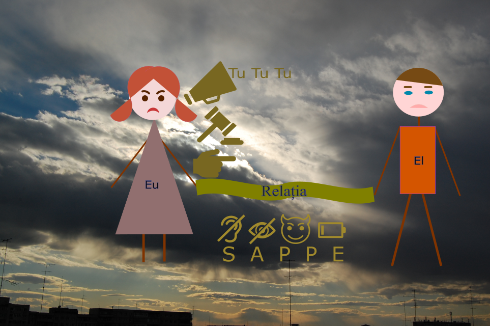 Îl foloseam cu succes și în relația cu prietena mea cea mai bună:”Mă enervezi când întârzii!”(culpabilizare), „Tu întârzii mereu!”(devalorizare folosind o generalizare). Și să nu uit de mesajele SAPPE pe care mi le adresam mie: „Trebuie să fiu o mamă perfectă”(injoncțiune), „Nu sunt suficient de bună” sau „N-o să mă descurc”(devalorizări).
